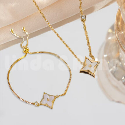Gelang Bunga Empat Daun Bermotif Belah Ketupat Kualitas Premium dengan Materi Kerang Putih, Gaya Elegan, dan Tidak Mudah Pudar