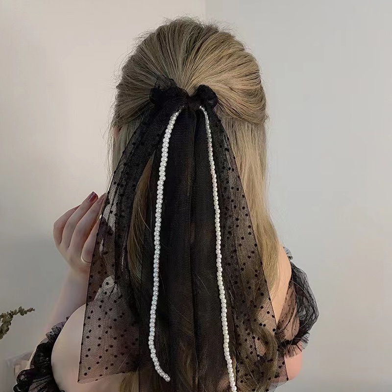 Ikat Rambut Karet Wanita Aksen Renda Mutiara Panjang Gaya