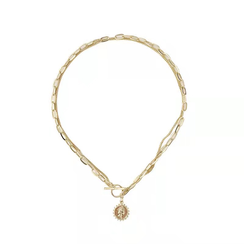 Kalung Rantai Logam Ganda Wanita Dengan Liontin Koin Kepala Cantik/ Aksesoris Fashion