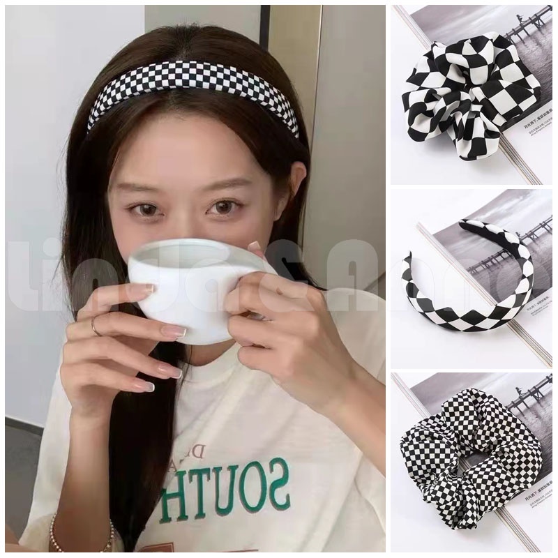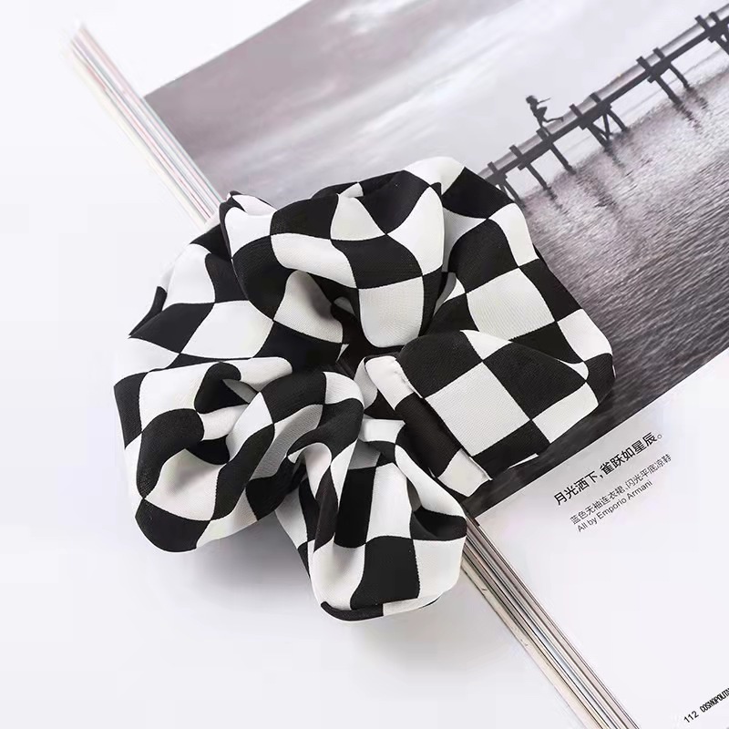 Ikat Rambut Monocrom Scrunchie Motif Papan Catur – Srunchie Kotak-Kotak Retro